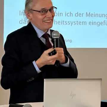 Peter Nowak betonte in seinem anschließenden Referat, dass Gesundheit nicht nur im Zusammenhang mit medizinischer Versorgung betrachtet werden sollte, sondern als ein umfassendes Konzept, das soziale, psychologische und umweltbezogene Aspekte einschließt, und er führte aus, welche Missionen der Gesundheitsversorgung bis 2035 umgesetzt werden sollten. Er gab dem Publikum zum Abschluss Anregungen mit, welche Reformen im Sinne seines „unfinished business“ in den nächsten Jahren notwendig wären.