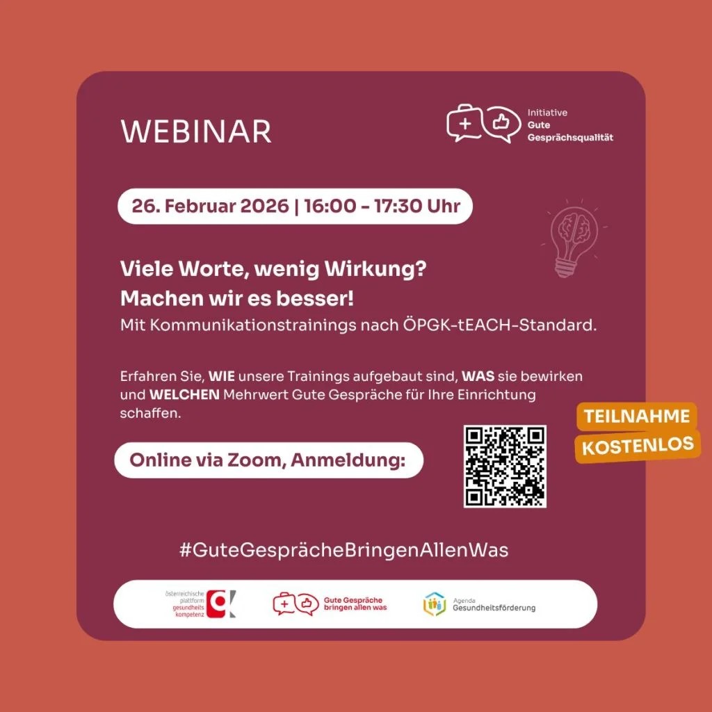 Die ÖPGK startet eine Webinar-Serie zu Guter Gesprächsqualität. Expertinnen und Experten der ÖPGK vermitteln dabei Einblicke in die einzelnen Trainingsmodule der nach ÖPGK tEACH-Standard zertifizierten Kommunikationstrainings und berichten über Anwendung und Mehrwert in der Versorgungspraxis. Dabei wird auch Raum für Fragen und Impulse gelassen. Die Teilnahme ist kostenlos!